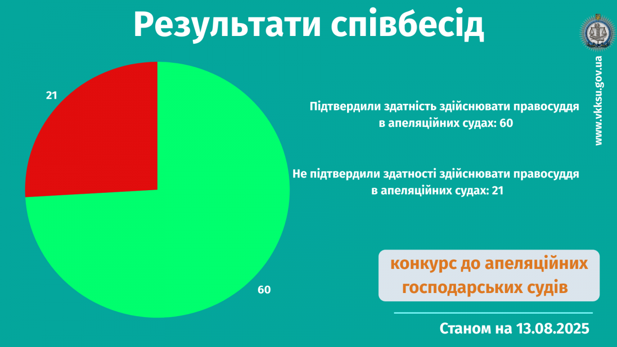 Завершено проведення співбесід з усіма кандидатами у конкурсі до апеляційних господарських судів: 60 кандидатів підтвердили здатність здійснювати правосуддя в апеляційному господарському суді, 21 кандидат – не підтвердив.