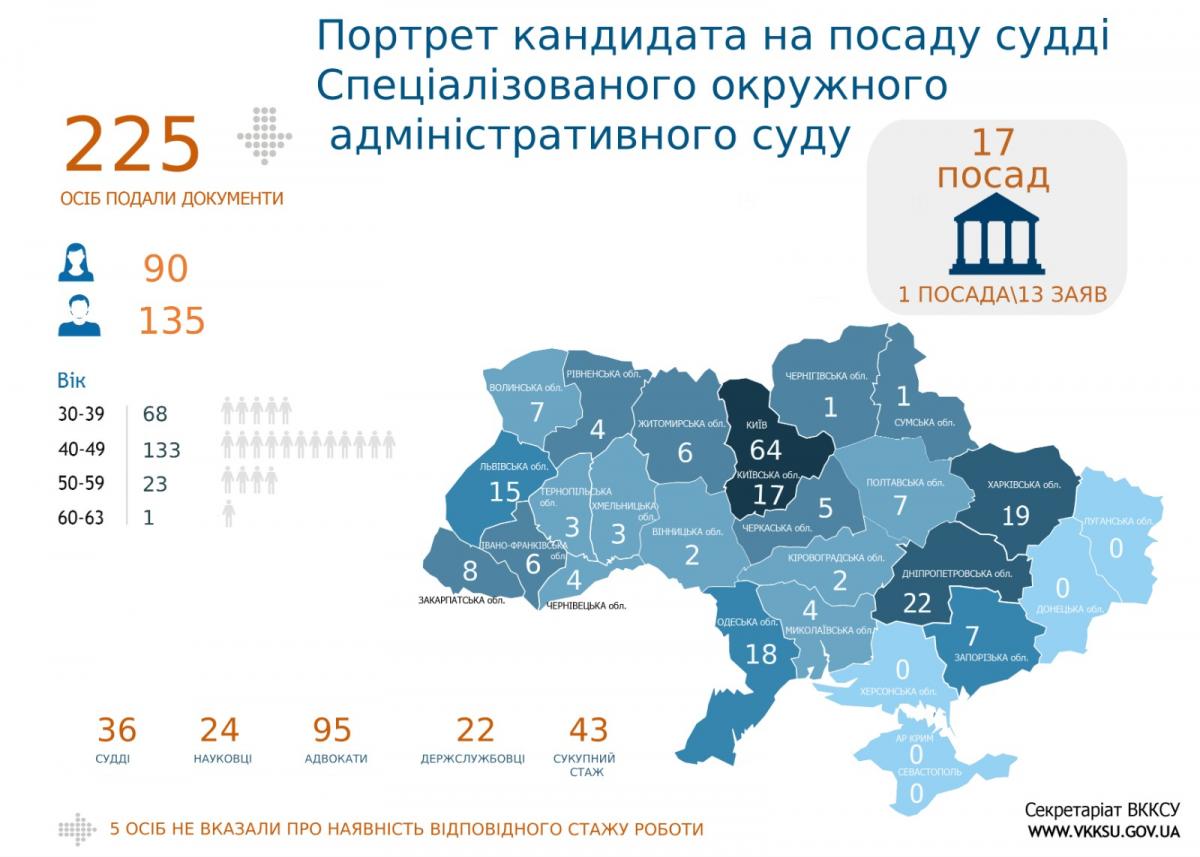 Для участі у конкурсах на зайняття вакантних посад суддів у Спеціалізованому окружному адміністративному суді та Спеціалізованому апеляційному адміністративному суді до Вищої кваліфікаційної комісії суддів України надійшло 356 заяв. Кількість унікальних кандидатів – 268 осіб, 88 кандидатів претендують на зайняття посад суддів в СОАС та СААС одночасно.