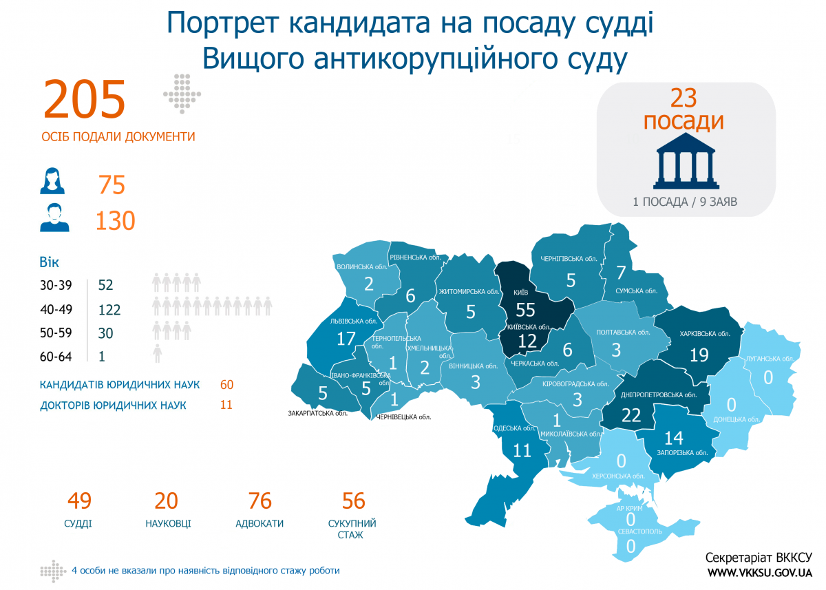 З 7 липня до 6 серпня 2025 року Вища кваліфікаційна комісія суддів України отримала документи від 205 осіб, які виявили намір взяти участь у конкурсі на 23 вакантні посади судді Вищого антикорупційного суду (оголошений 3 червня 2025 року).